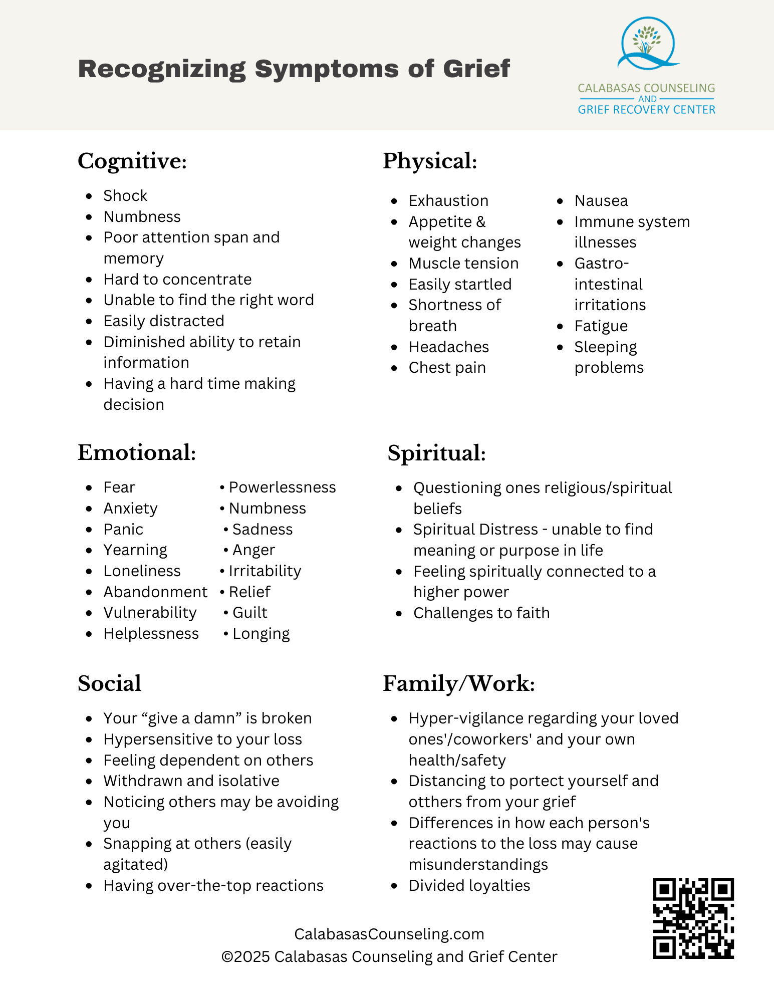 Grief is a natural response to loss, but it can show up in many different ways. Whether you're grieving the loss of a loved one, a pet, or a significant life change, understanding how grief impacts you can help navigate this emotional journey. Grief affects us physically, emotionally, mentally, socially, and even within our family or work lives. Recognizing these symptoms is an important step toward healing.